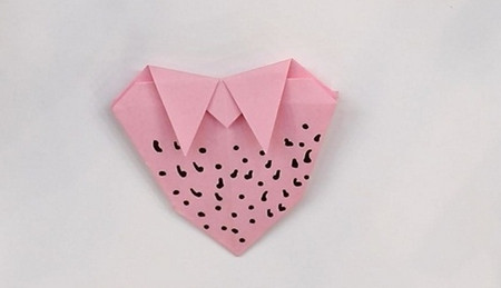 6、反面三角形也往下折,再用黑色笔在正面画上黑点,一个简单草莓就折好了。