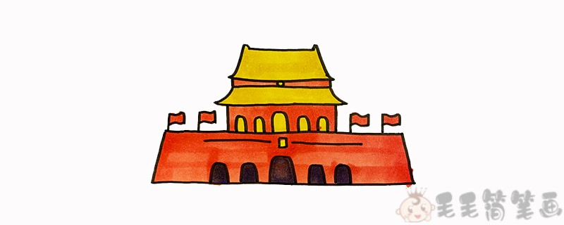 第四步:接下来给北京天安门的城墙全部涂上红色,将红旗也涂上红色。这样一个庄严的北京天安门就完成了
