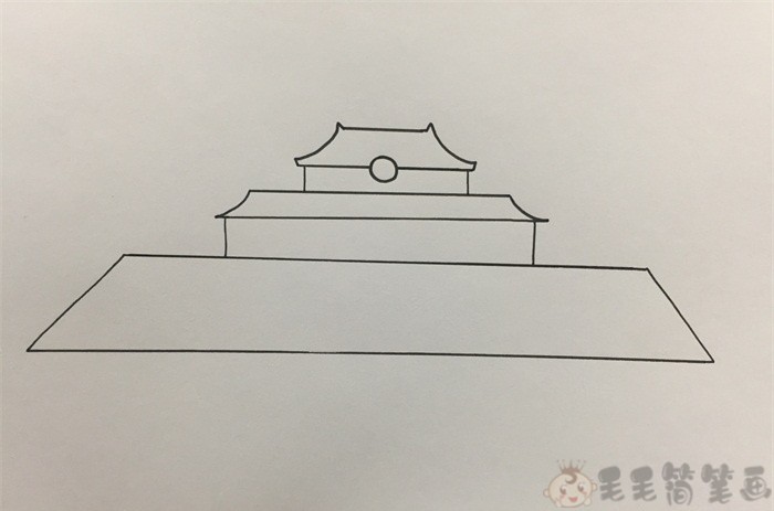 第二步:将最上层的墙壁花花粗后,同样地再将第二层檐顶与墙壁画出来,再来画出底部梯形样式的城墙