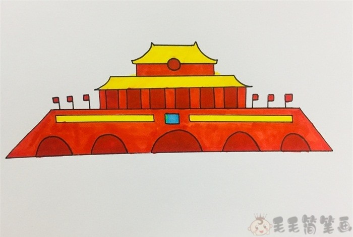 第五步:最后将檐顶用黄色涂上,城墙上的标语和牌匾用黄色和蓝色涂上,庄严的北京天安门就画好啦