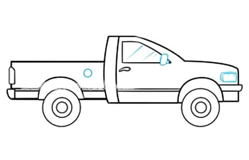 步骤六:向车辆添加更多细节。用两条直线和一条曲线包围乘客窗。画一个类似逗号的曲线形状来表示门把手。画一个半圆穿过卡车的床,另一个在前端,表示车轮。在卡车床的后面围上弯曲的矩形以表示后保险杠和尾灯。继续从卡车床对面的驾驶室平行线,并绘制从前挡泥板到卡车前面的弯曲矩形代表前保险杠。
