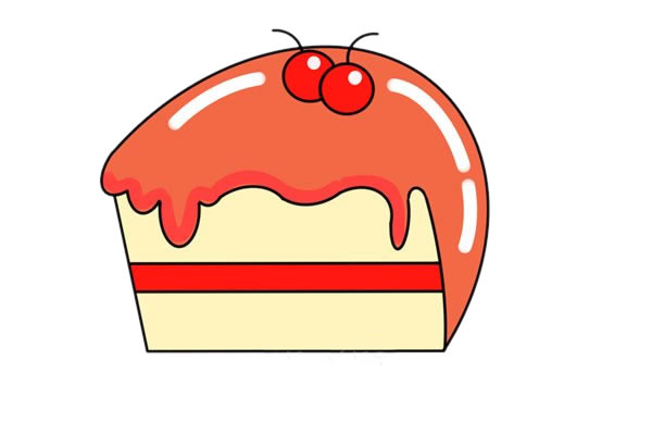 夹心蛋糕简笔画的彩色画法:这个夹心蛋糕看起来是不是很诱人? 仿佛涂了厚厚的一层奶油,还在顶部放了两个小樱桃作为点缀。喜欢吃蛋糕的同学尝试下吧!