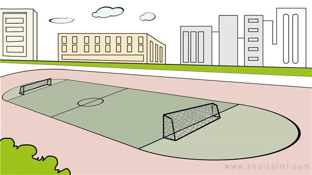 先将中央区域的足球园地涂上2种差其余浅绿色。再将外围的跑道涂上淡红色。再快要处植物和远处的草坪涂上翠绿色。再将远端的教学楼涂上差其余颜色。最后将飘散在天上的云朵涂上淡淡的天空色。这样,校园一角的运动场简笔画就画好了。