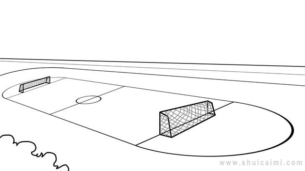 先画出足球园地中的2个球门,近处的大一些,远处的小一些,球门框用粗一些的直线和斜线组合而成,球网用灰色的细线画出。再画出近端角落里的植物。