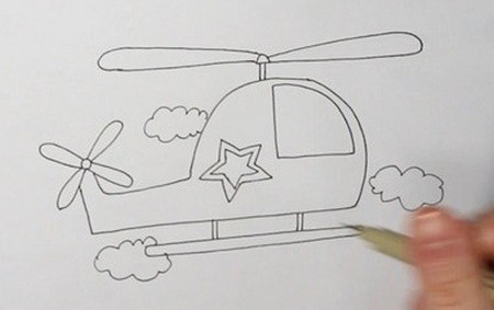 我们首先把直升飞机的轮廓画出来,前面大后面小,然后在机身前面画上窗户和一个五角星,机身后面画上尾翼