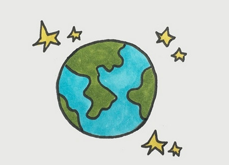 最后给地球涂上颜色,陆地涂上绿色,海洋涂上蓝色,星星涂上黄色。一个简单又漂亮的地球就画好了。