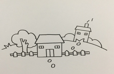 接着在门前画出几个小圆圈,表示是乡村的石子路,在栏杆的后面画出一颗大树,树的后面就是乡村的小山坡,在山坡上还有一户小房子。