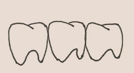 首先画两条向内的弧线画出牙齿的形状,然后用两条相交的弧线和一条倒“U”形的弧线画出牙冠和压根。