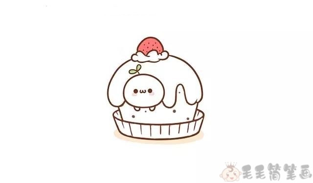 第一步:先画蛋糕顶部的小草莓,草莓下面画上一小块奶油,再画出像瀑布一样留下来的奶黄