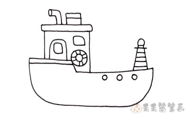 第二步:然后在左边画上建筑物,画一个类似于长方形的建筑,补充门窗,再在墙面上画一个游泳圈,顶上画出“╗”形状的烟囱和一个长方形,继续在船头位置画一个顶部是圆球的梯形