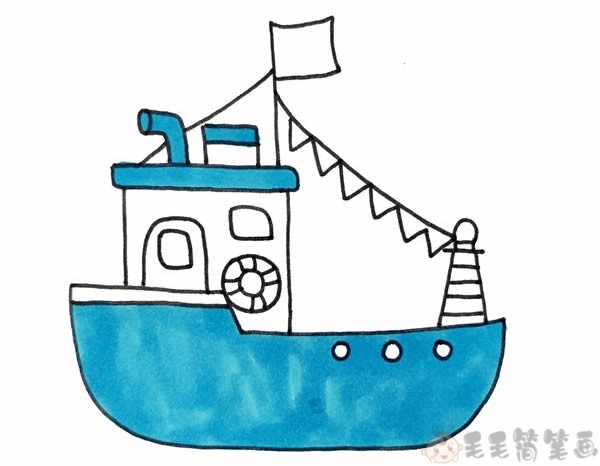 第五步:窗户和圆形建筑物涂上另外的蓝色,旗帜和泳圈涂红色,小彩旗用红色和青色交替涂色,简单的渔船简笔画就画好了
