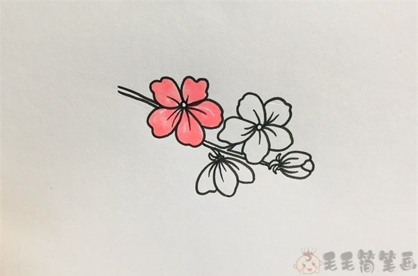 第二步:再画上树枝和两朵其他角度的桃花,注意底部桃花的方向