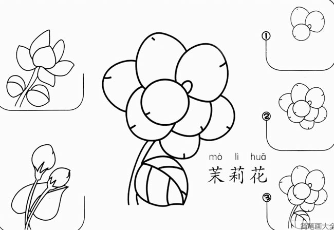 茉莉花怎么画简笔画步骤图解:今天我们来学画的是茉莉花怎么画简笔画步骤图解,喜欢的同学,就跟下面的绘画教程一起来看看是怎么画的吧!