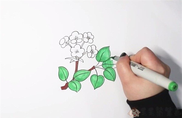 第五步:最后用黄色和浅绿色涂花蕊部分,清新可爱的梨花就画好啦