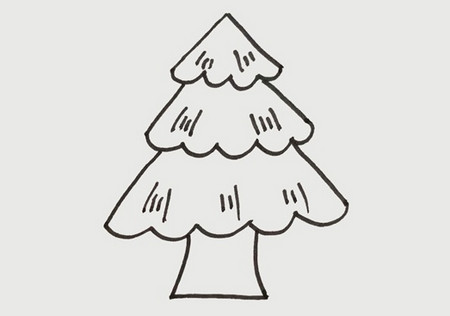 1、先画出松树树顶尖尖的部分。形状类似于一个底是波浪线的三角形。先画出一个尖角,再画出一条波浪线围成一个三角形。 2、往下画出第二层,形状类似于一个短裙,然后画出第三层。越往下树冠就越来越大,像一个金字塔。 3、然后画出一个粗短的树干。在树叶上画出一些三条竖线做装饰。让松树变得更加的好看。