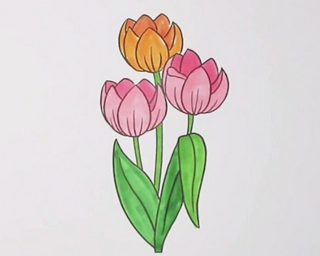 最后就是涂色了,先给花朵涂上粉色和黄色,再给郁金香花茎和叶子涂上绿色,简单的郁金香简笔画就完成啦!